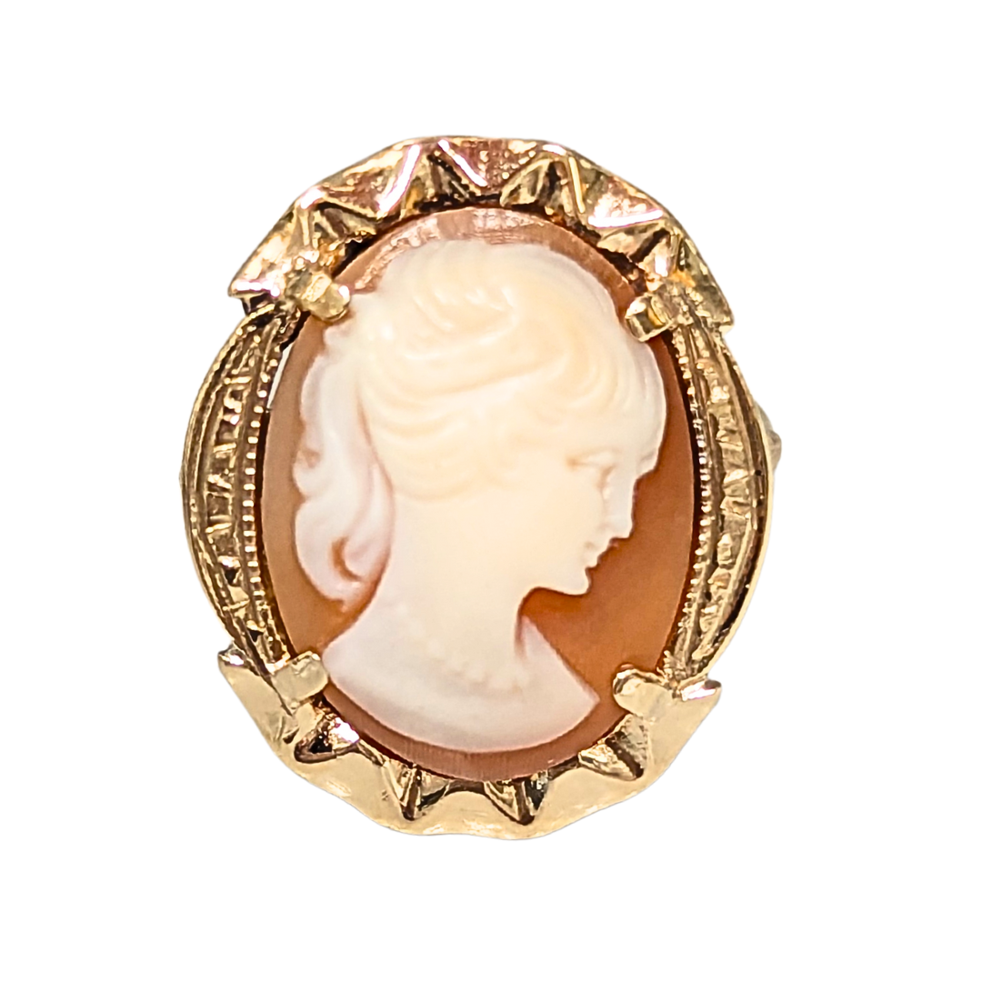 This 10K yellow gold ring features a finely detailed cameo carving, showcasing timeless craftsmanship. The warm hue of the gold complements the intricate relief work, making it a distinguished piece suitable for those who appreciate classic artistry in jewelry. Durable and elegant, this ring offers a refined statement that can be worn daily or reserved for special occasions.