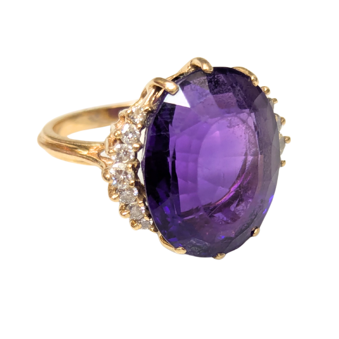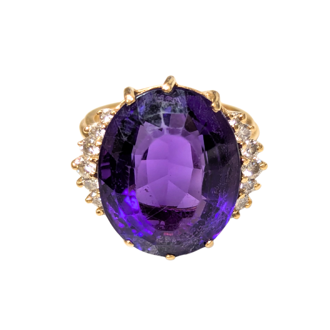 14K yellow gold amethyst ring with one oval amethyst measuring 18 x 14.5 x 10mm and weighing 15.60 carats. 14 round brilliant diamonds on the sides weighing .38 carats, G color and SI1 clarity. One diamond is chipped.