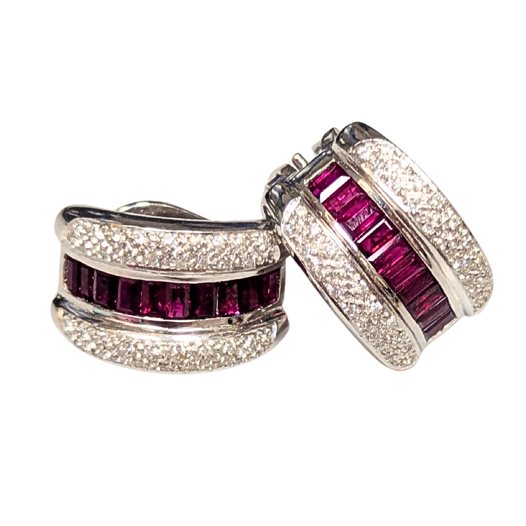 18K white gold ruby and diamond earrings with a convertible post. 20 straight baguette rubies weighing 3.29 carats and 38 round brilliant diamonds weighing 0.49 carats, G color and VS2 clarity.