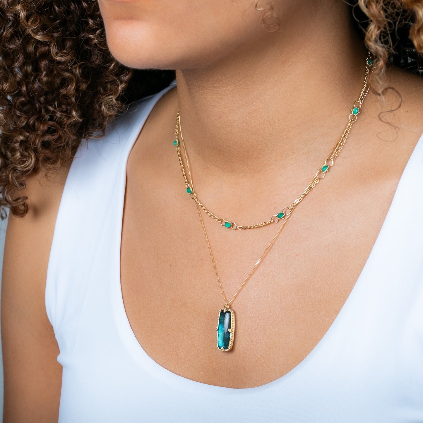 This rectangular labradorite reveals rich blue-green tones that shift and glow as they catch the light, creating an almost mystical effect. Known for its captivating iridescence, labradorite has long been cherished for its ever-changing colors and natural allure. We’ve set this one-of-a-kind gemstone in a handcrafted gold bezel, secured with delicate granulated prongs. A piece that truly highlights the beauty of labradorite’s natural luminescence.