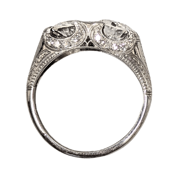 Platinum hand engraved two stone ring with a .84 carat M color VS1 clarity old european cut diamond and a .97 carat H color VS2 diamond. there are 20 single cut diamonds that total .10 carats H color VS2 clarity